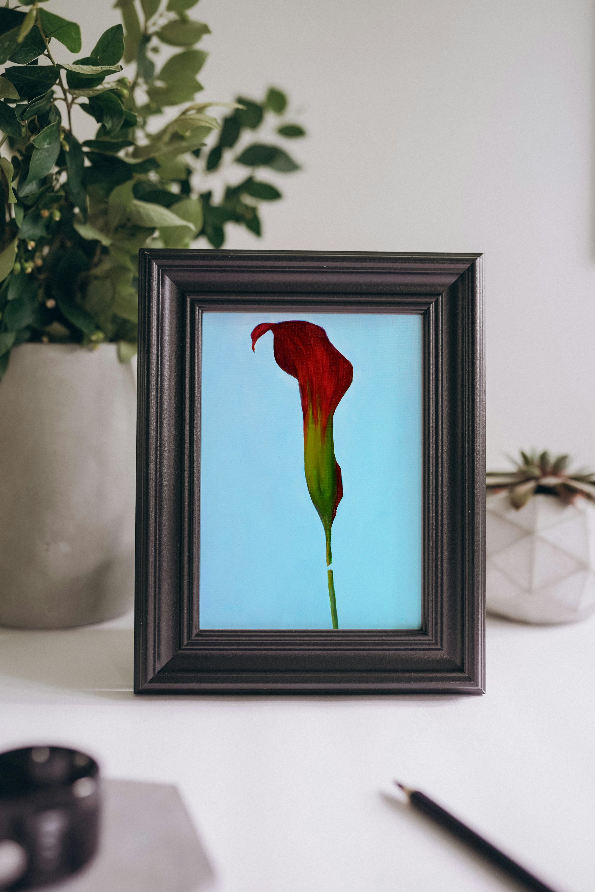 I purchased a beautiful calla lily plant from the store and once on my patio it erupted into an array of multi-colored lilies. However, one small flower's stem started to lean and then droop. To rescue it from an inevitable fate and embarrassment among its fellow lilies, I cut its stem and placed the flower in a small vase that stood on my desk. It held its beautiful color and shape for the longest time and I decided to paint it as it stood valiantly next to me.