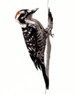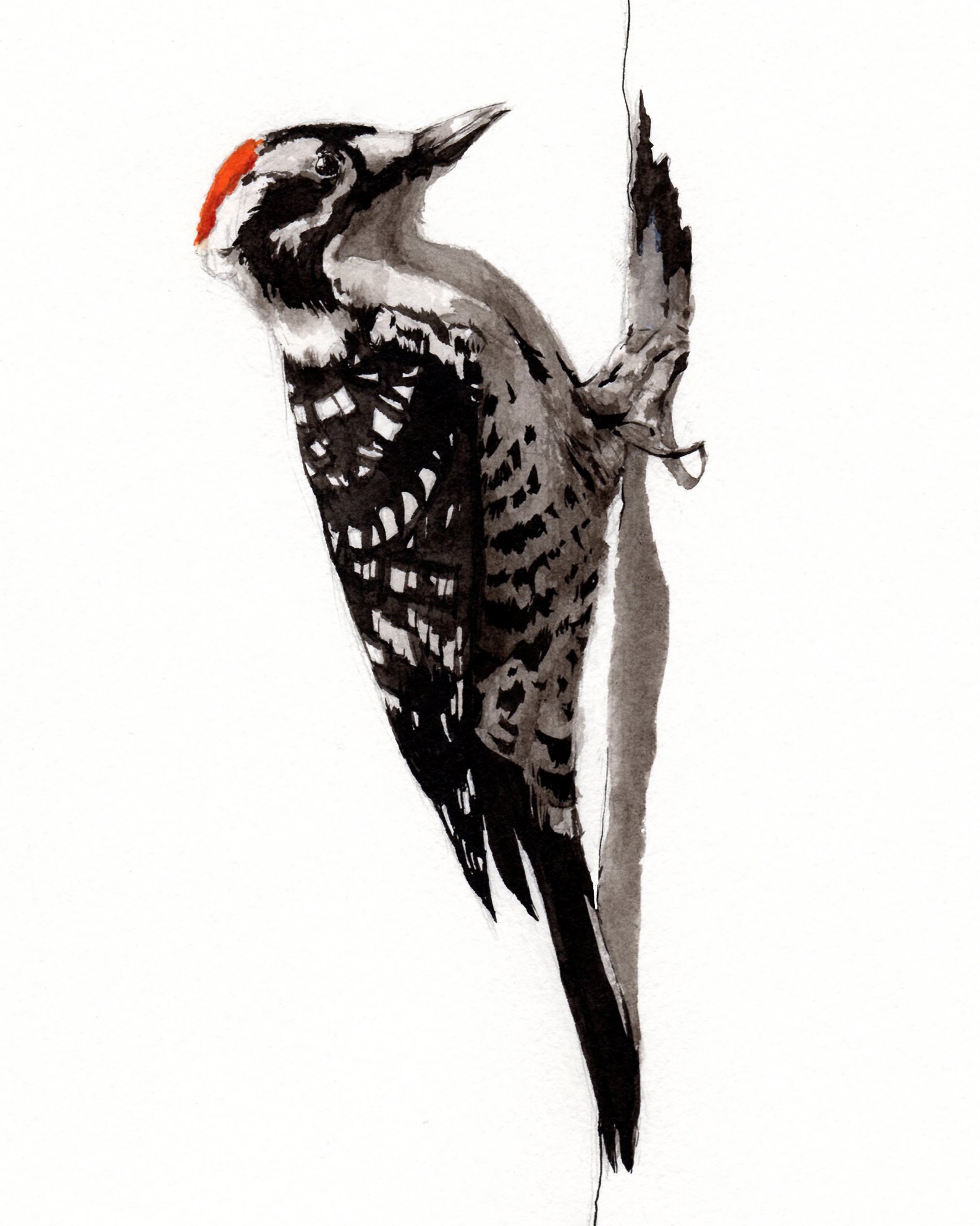 Based on a Nuttall's Woodpecker that created residence outside my studio window in the decaying trunk of a bloomed century plant (Agave Americana). I was riveted by his presence and progress. I watched it build its home, find a mate, and eventually three baby woodpeckers appeared (one pictured poking its head out) from inside the tiny confines of his home.
