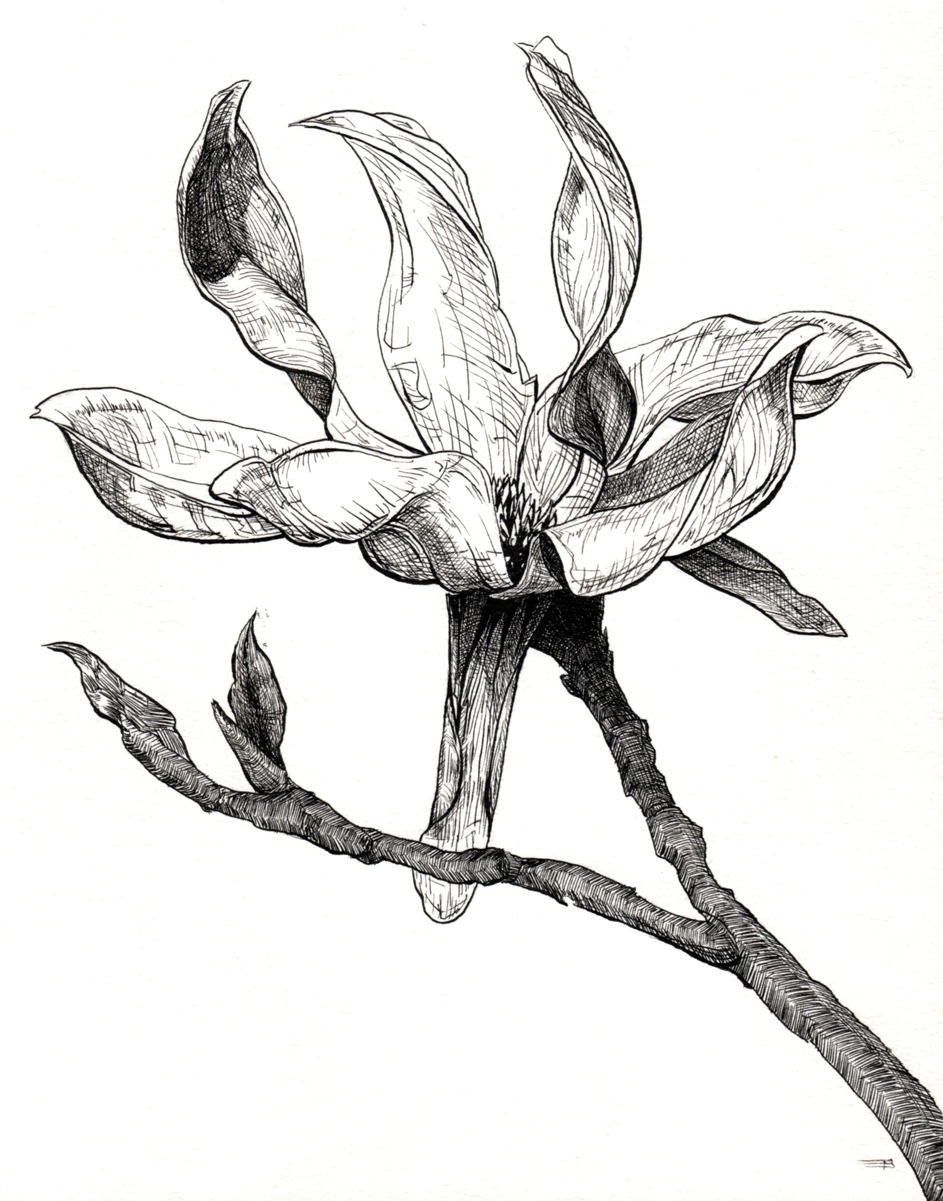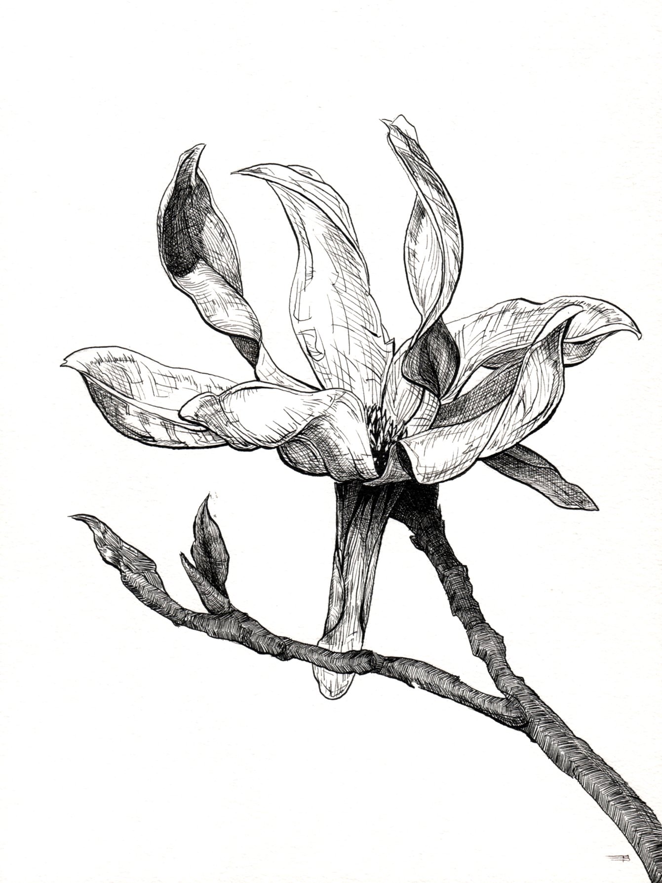 One of my all-time favorite ink works I've created, The Magnolia, was drawn with hundreds (possibly thousands) of intricate lines using a nib dipped in India Ink on Strathmore 400 Series Watercolor paper.