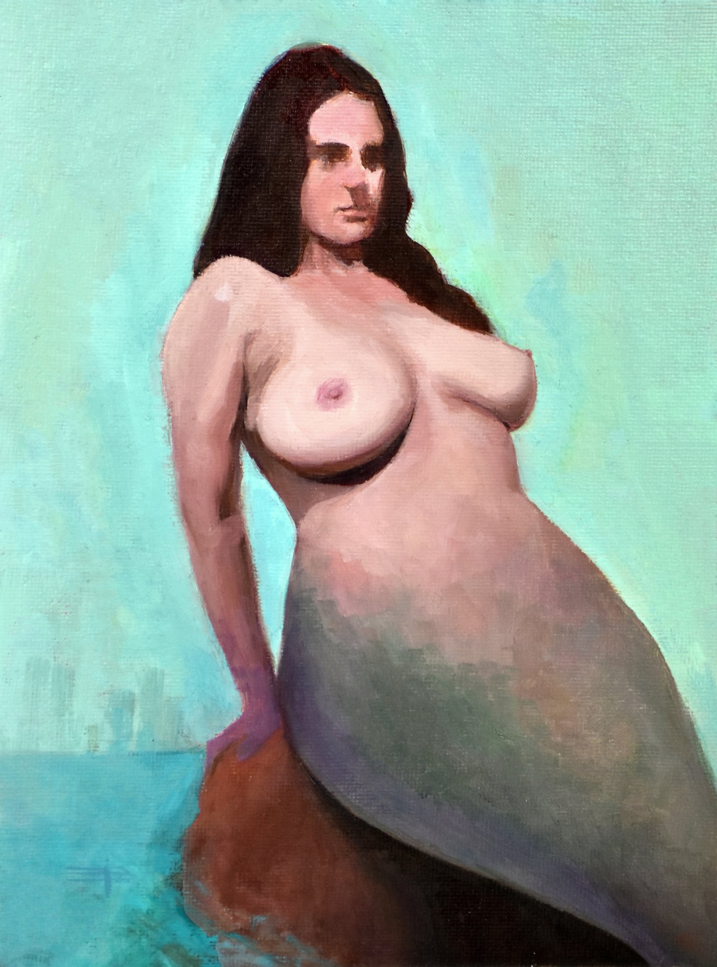 One of the fun parts about painting is seeing where a painting leads you. I began with a normal figure painting of model Tamara and as I painted her lower torso I noticed the form and lines had a flow and voila, she became a mermaid.